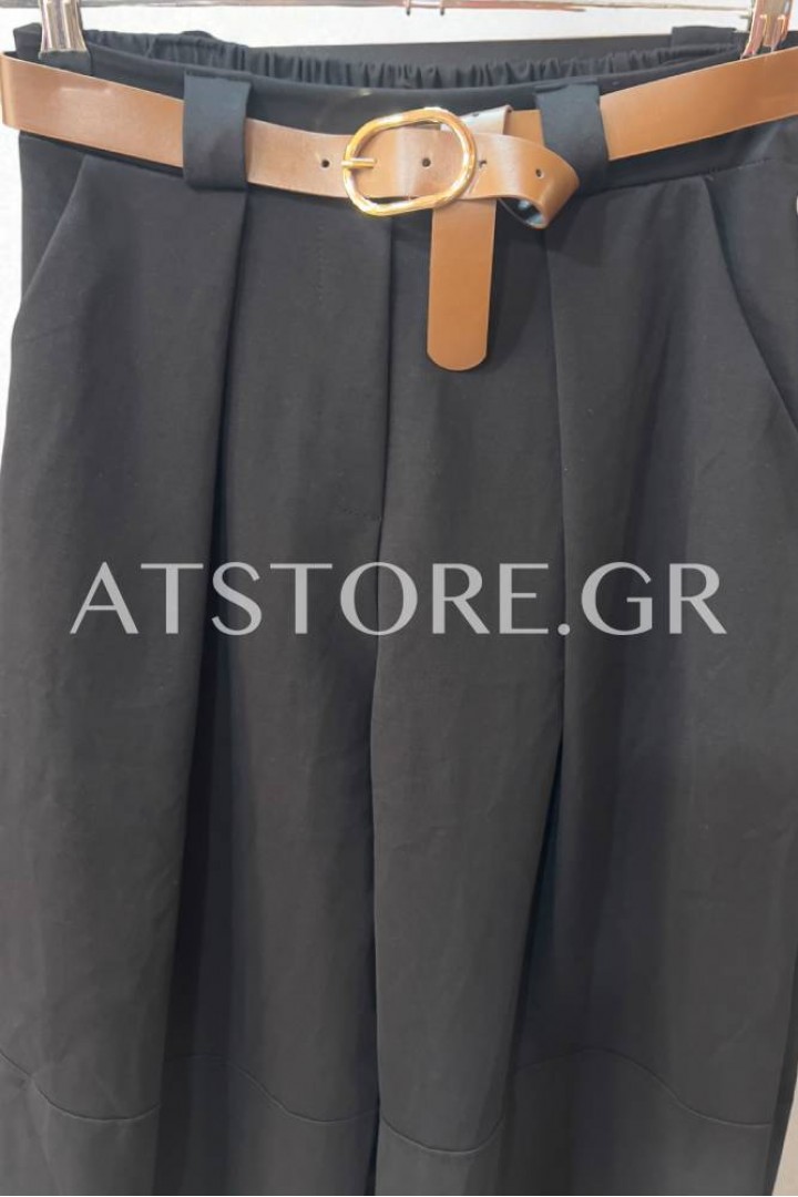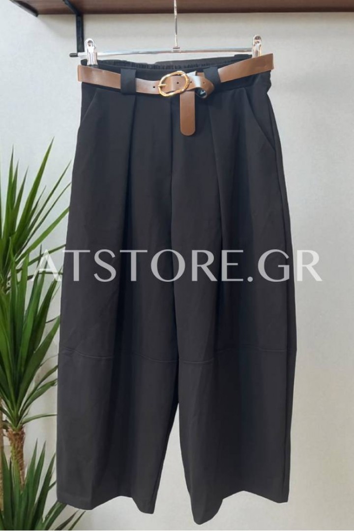 - Ψηλόμεσο παντελόνι σε barrel γραμμή. Έχει πιέτα μπροστά, λάστιχο στο πίσω μέρος της μέσης και δική του καφέ αποσπώμενη ζώνη.